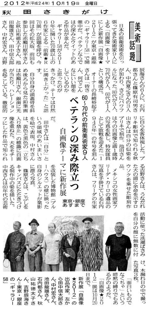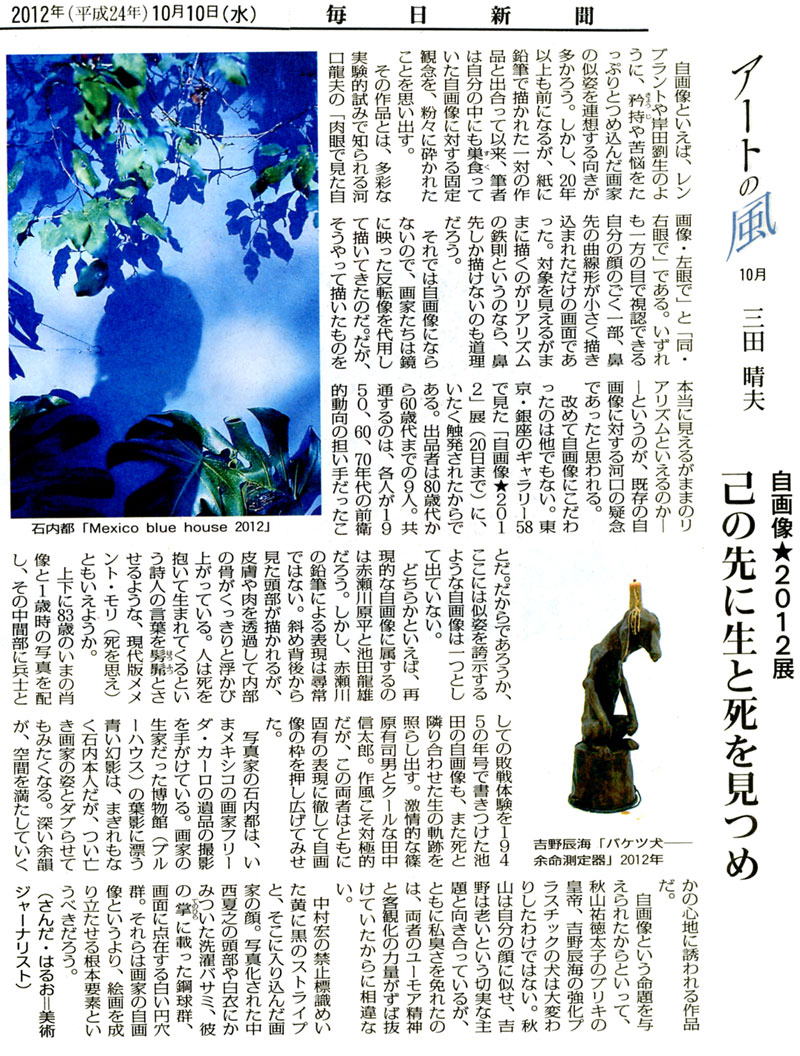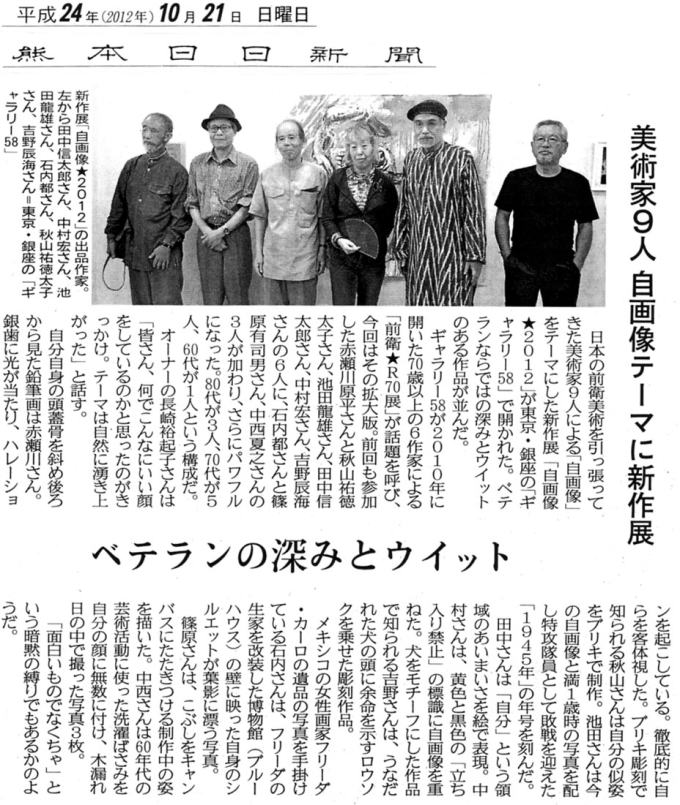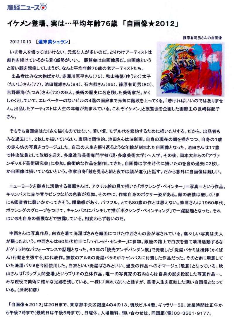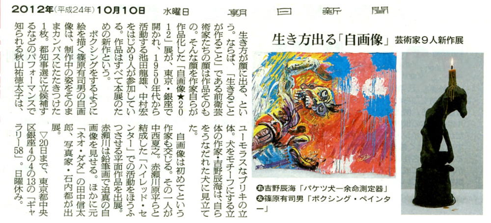 毎日新聞「アートの風」 2012年10月10日 産経ニュース【週末美シュラン】 2012年10月13日 カロンズネット 編集部ノート 2012年10月11日 読売新聞「篠原有司男 前衛の半世紀」2012年10月18日