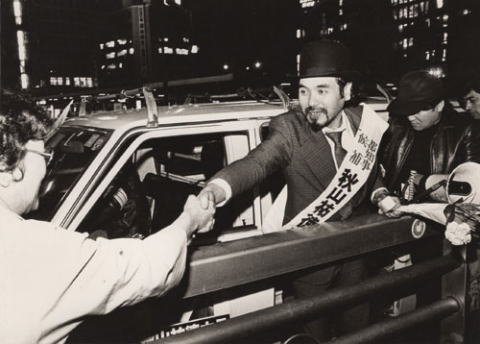 | 独創的なブリキ彫刻や、グリコのランナーを模した「ダリコ」パフォーマンスで知られる美術家・秋山祐徳太子(1935-2020)は、政治のポップ・アート化を目指して1975年と79年の2度にわたり、東京都知事選に立候補します。街頭や立合演説会場、テレビ・ラジオの政見放送、560万部の選挙公報、1万2千箇所のポスター掲示板、そのすべてを芸術行為の現場とし、当落を超越したひたむきな選挙活動は人々の脳裏に鮮烈な印象を残しました。このときの選挙ポスターは現在、芸術作品として諸美術館に収蔵されています。 本展では、選挙ポスターや写真、映像をはじめ、音声記録、候補者届出書、供託書、選挙公報、候補者用特殊乗車券、腕章、旗、そのほか初公開の資料を多数展示いたします。40数年前の東京都を舞台に繰り広げられ、華々しくも健気に散った秋山祐徳太子候補の泡沫芸術パフォーマンスをお楽しみください。 |