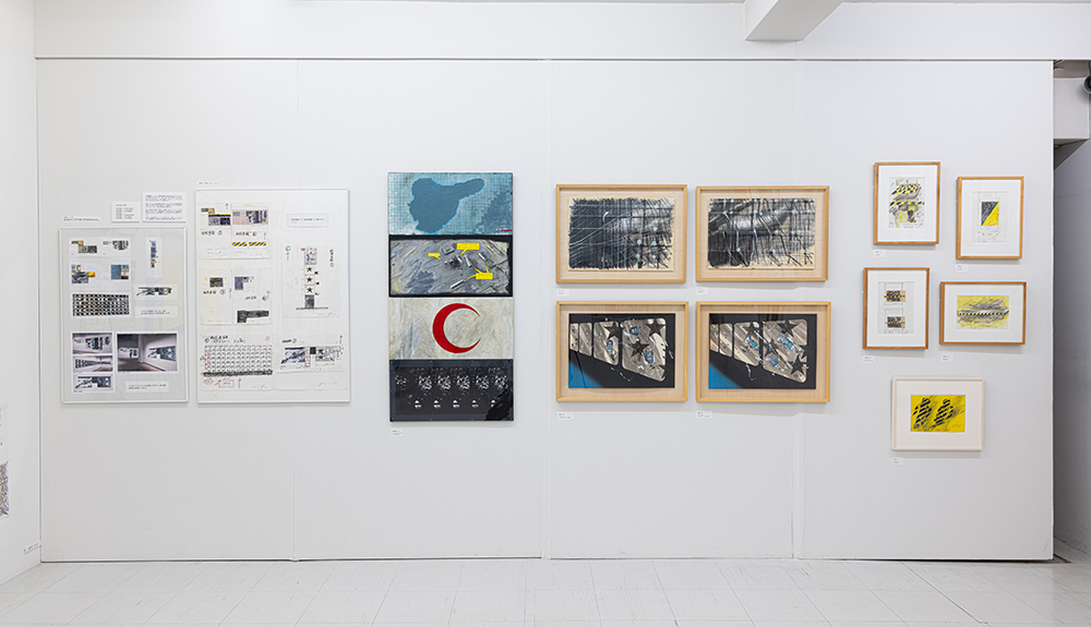 《絵図連鎖(えずれんさ)》シリーズは、複数の画面を不規則に組み合わせ、モンタージュ効果を生み出すとともに、「絵」と「図」とは何かを問いかける作品。展示は第三者に委ねられ、自由な配置により新たなイメージが生み出される。2002年から2006年にかけて制作された。この資料は、2007年に東京都現代美術館と名古屋市美術館で開催された回顧展「中村宏丨図画事件 1953-2007」に向けての展示構想資料と推測される。本展では、《絵図連鎖-1》から《絵図連鎖-7》までの展示プラン合計 5枚を紹介する。
